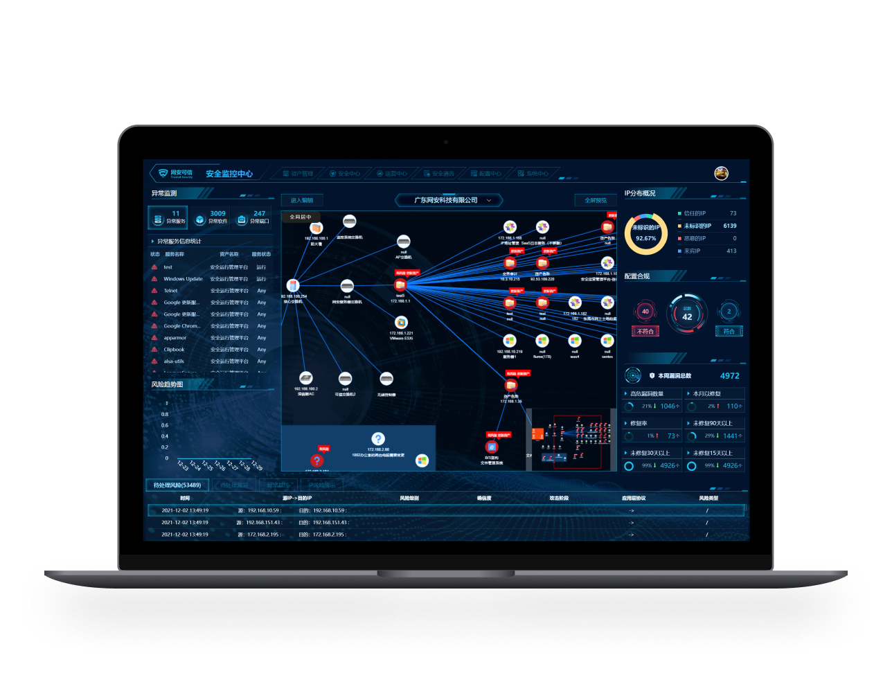 安全運營管理平臺是集資產管理、IP管理、資產處置、基線管理、風險管理、漏洞管理、安全通告、運營中心于一體的系統,在平臺上解決技術人員、業務人員、管理人在資產管理、項目管理、安全運維、運維巡檢等工作問題